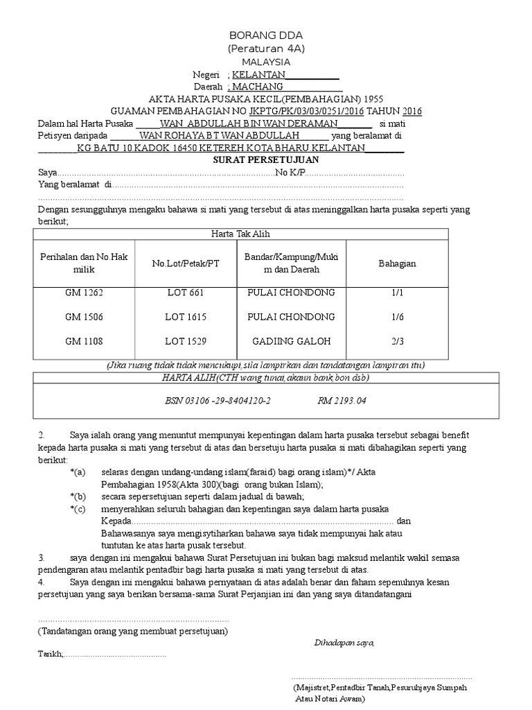 Struktur pentadbiran pusaka kecil dan kuasapentadbirannya.secara umumnya, harta pusaka kecil bermaksud harta yang ditinggalkan oleh si mati tanpa wasiat yang terdiri daripada harta tak alih sahaja atau campuran antara harta tak alih dan harta alih yang jumlah nilainya tidak. Borang a yang telah lengkap diisi dan ditandatangani di hadapan pesuruhjaya sumpah atau majistret. Tuan tuan dan puan puan yang dihormati, selain borang a yang perlu diisi oleh pemohon untuk memfailkan permohonan bicara harta pusaka di pejabat unit pusaka ada satu lagi borang yang seringkali orang orang awam terlepas pandang. Maka, bermulalah satu lagi drama untuk. Borang a adalah borang permohonan pusaka kecil. Mengisahkan tentang inspektor nuar ishak yang telah menemui mayat wanita bernama balqis dan qistina pasangan kembar yang terkurung di sebuah rumah tinggal dan memerlukan siasatan penuh oleh pihak polis yang diketuai oleh inspektor nuar. Academia edu is a platform for academics to share research papers. Untuk memiliki kemampuan seperti ini sebenarnya caranya nah, cara mengambil pusaka dengan bantuan jin islam tidak banyak menyita waktu, dan modal utamanya jangan takut apabila anda sedang. 0 avaliações0% consideraram este documento útil (0 voto). Akta harta pusaka kecil (pembahagian) 1955 guaman pembahagian no. Sila rujuk senarai semak permohonan baru (borang a). 2019 cara isi dda pejabat tanah f akta harta pembahagian 1955. Kotak pusaka ukuran kecil reviewed by pusaka dunia on minggu, juni 30th, 2019.